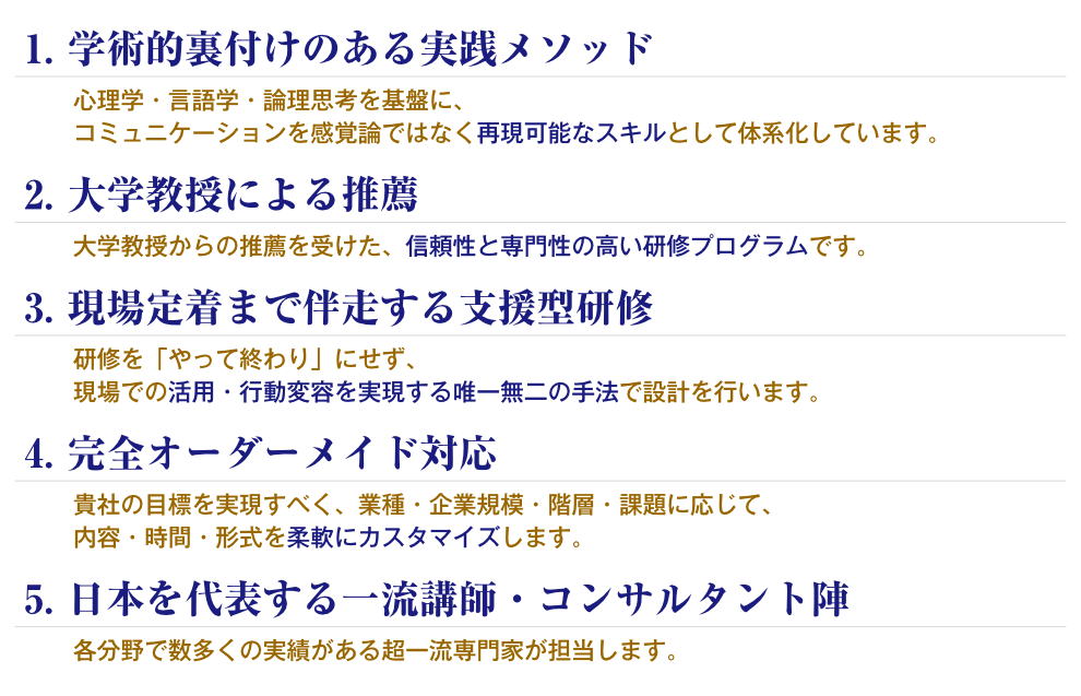 心理学・言語学・論理思考をベースにした独自メソッドと、大学教授による学術的裏付けを強みに、現場で“使える”変化を生み出すことにこだわります。