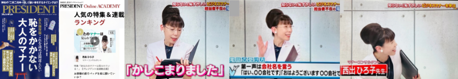 「ソロモン流」:弊マナーグループ代表西出ひろ子が『マナーの賢人』として、企業コンサル風景がドキュメンタリーとして密着取材されました。「スーパーJチャンネル」:弊マナーグループ代表西出ひろ子の営業接客コンサルティングの風景が密着取材されました。